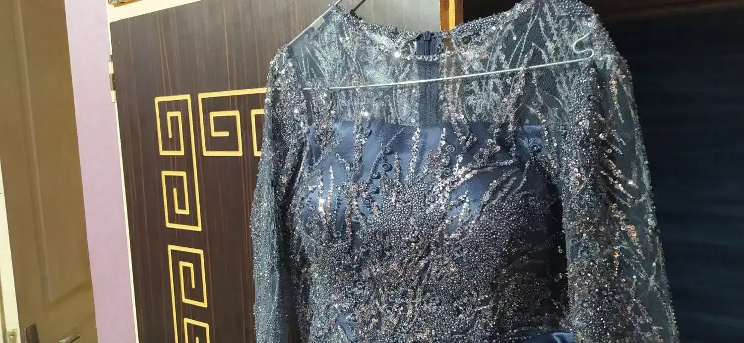 لباس مجلسی درباری گیپور سنگ دوزی شده شیک آبی رنگ درحد نو معاوضه با مجلسی سایز41